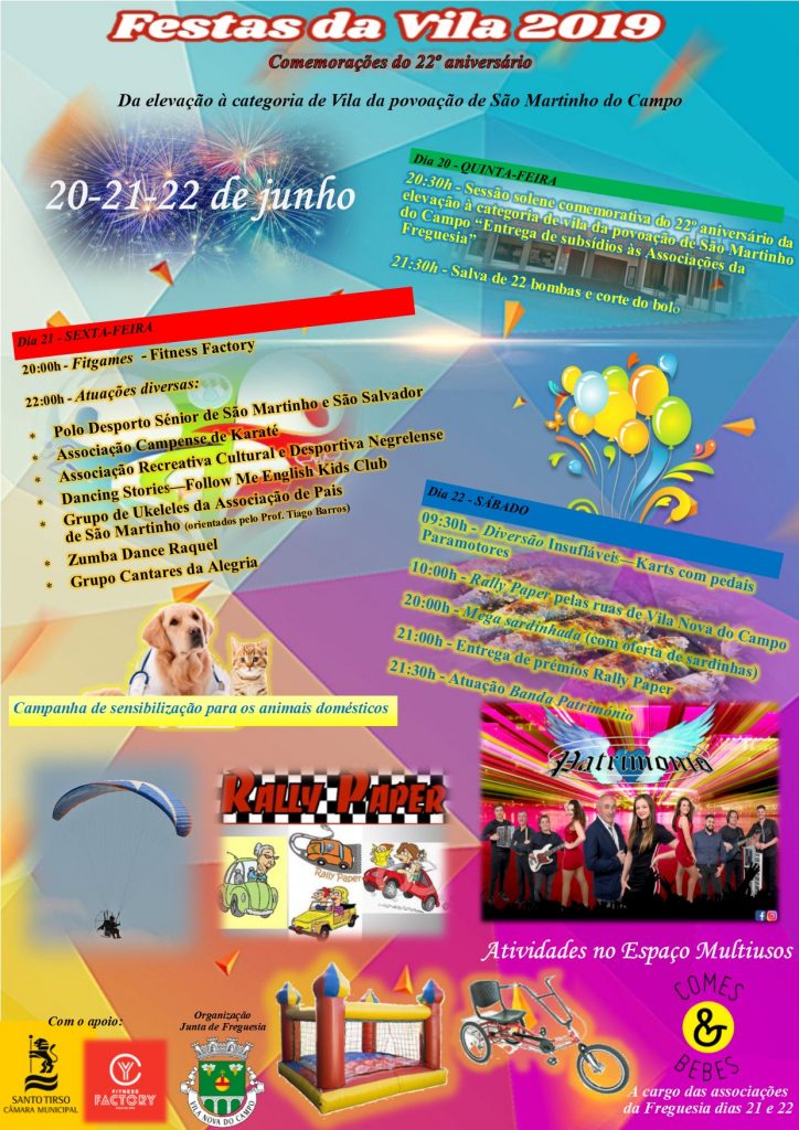 Durante três dias (20, 21 e 22 de Junho) a agora denominada Vila Nova do Campo assinala a passagem de mais um aniversário de elevação à categoria de vila da povoação de São Martinho do Campo.