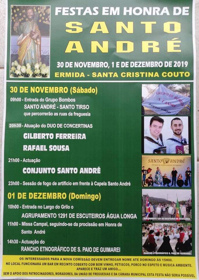 Este fim de semana, dias 30 de novembro e 1 de Dezembro, a povoação de Santa Cristina do Couto na União de Freguesias de Santo Tirso, Couto-Santa Cristina e Burgães, vai estar em festa com as habituais celebrações em honra de Santo André no lugar da Ermida.