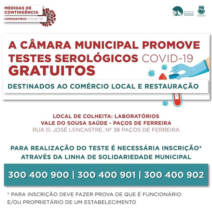 Por forma a monitorizar a situação pandémica no concelho, bem como reforçar a confiança no comércio local e restauração, a Câmara Municipal de Paços de Ferreira vai assegurar, de forma gratuita, a realização de testes serológicos a todos os funcionários e proprietários destes estabelecimentos.