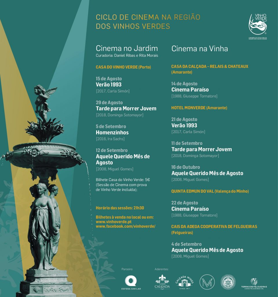 Entre 14 de Agosto e 16 de Outubro, a Região dos Vinhos Verdes promove um Ciclo de Cinema com uma dezena de sessões distribuídas entre vinhas e jardins, para descobrir filmes portugueses e estrangeiros na companhia de provas de Vinho Verde e experiências ao ar livre.