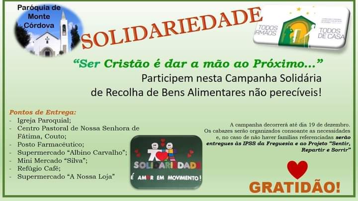 Sob o mote “Ser cristão é dar a mão ao próximo…”, a Paróquia de Monte Córdova está a organizar uma campanha solidária de recolha de bens alimentares não perecíveis.
