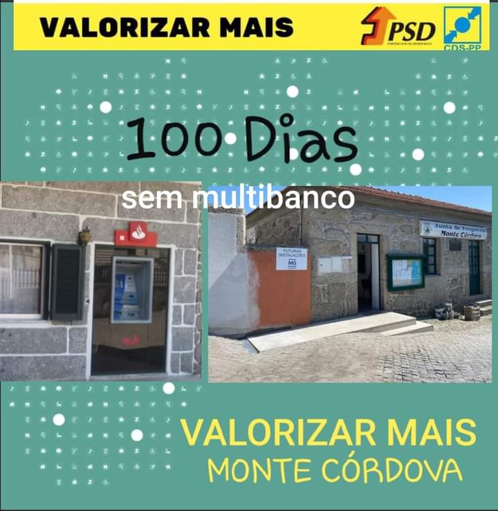 A Candidatura valorizar + Monte Córdova, liderada por Pedro Ferreira, assinalou na sua página oficial os 100 dias sem multibanco em Monte Córdova.