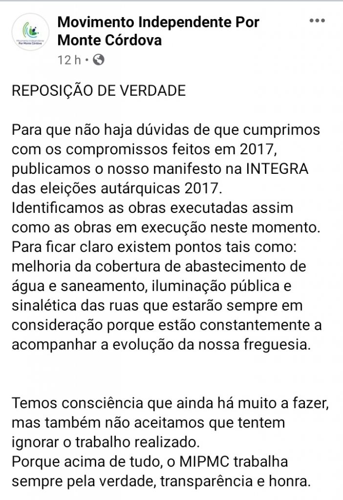 A reação por parte do Movimento Independente Por Monte Córdova, surgiu esta terça-feira com a candidatura de Andreia Correia a argumentar com um post que intitulou de “reposição da Verdade”.