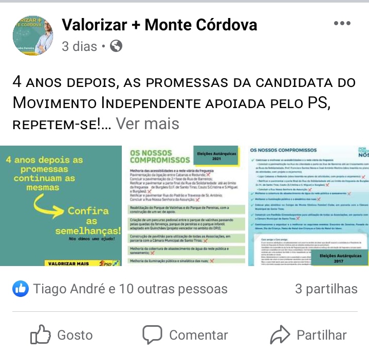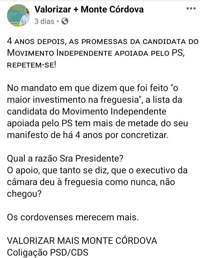 Com o aproximar do dia das eleições, nas redes sociais, a campanha eleitoral para a Assembleia de Freguesia de Monte Córdova, começa a aquecer.