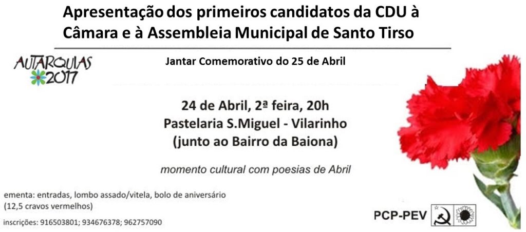 O repasto vai acontecer na próxima segunda feira, 24 de abril pelas 20 horas, na Pastelaria S. Miguel em Vilarinho (junto ao Bairro da Baiona) e conta com um momento cultural, onde serão declamadas Poesias de Abril.