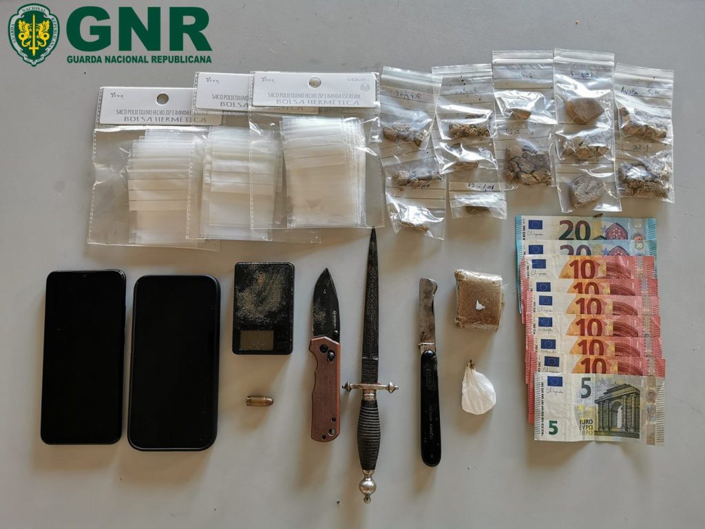 Durante a operação, foi realizada uma busca domiciliária que permitiu apreender diverso material associado à atividade criminosa. Entre os bens apreendidos encontram-se 164 doses de haxixe, 18 doses de cocaína, 105 euros em numerário, uma balança de precisão, dois telemóveis e ainda um punhal.