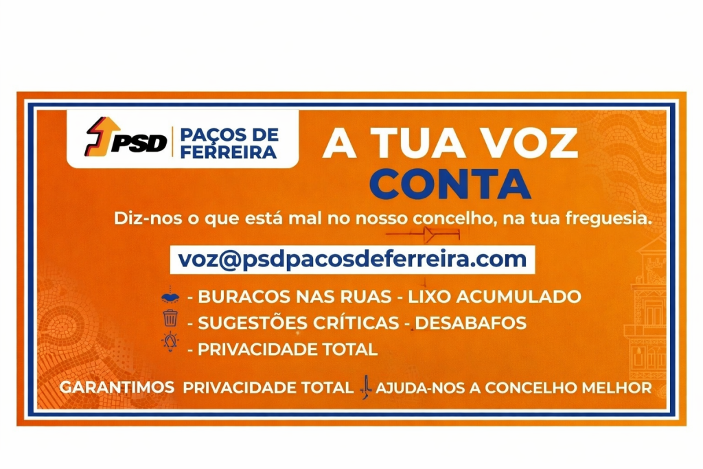 O PSD de Paços de Ferreira lançou uma nova iniciativa de participação cívica com o objetivo de dar voz direta aos cidadãos do concelho. Através do endereço de email voz@psdpacosdeferreira.com, qualquer pessoa pode agora partilhar problemas, preocupações ou sugestões relacionadas com a sua freguesia ou com o território municipal.