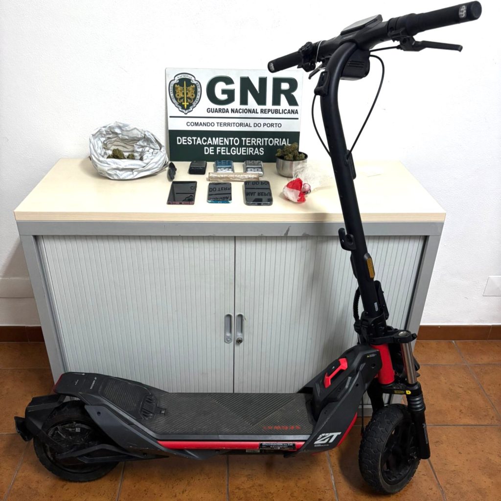 No decurso da intervenção, foi realizada uma busca domiciliária que resultou na apreensão de 317 doses de canábis, 65 doses de cocaína, três balanças de precisão, três telemóveis, uma faca de cozinha, uma trotinete e diverso material utilizado no acondicionamento e embalamento de produto estupefaciente.
