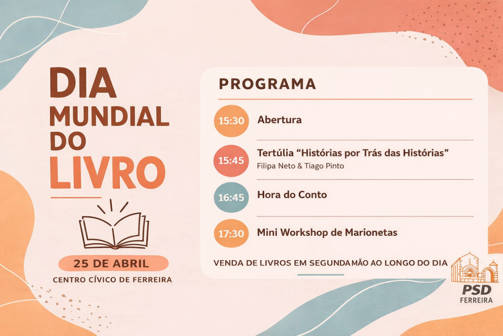 O PSD de Ferreira promove, no próximo dia 25 de abril, um conjunto de iniciativas culturais para assinalar o Dia Mundial do Livro, no Centro Cívico de Ferreira, com atividades dirigidas à comunidade.