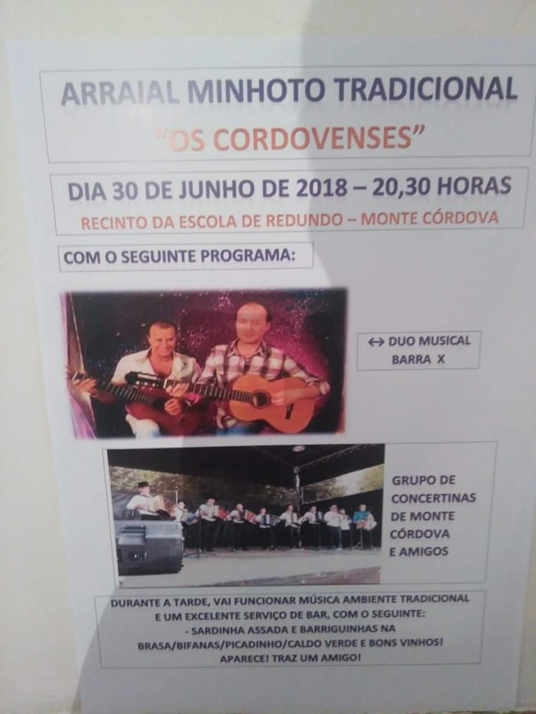A Associação Cultural Popular de Bombos e Concertinas Os Cordovenses, dinamizam no próximo dia 30 de junho um Arraial Minhoto Tradicional.
