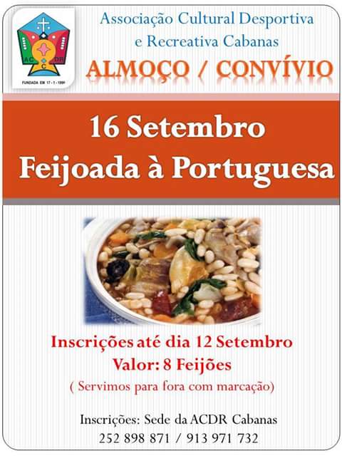A Associação Cultural Desportiva e Recreativa de Cabanas, promove um Almoço/Convívio no próximo dia 16 de setembro.