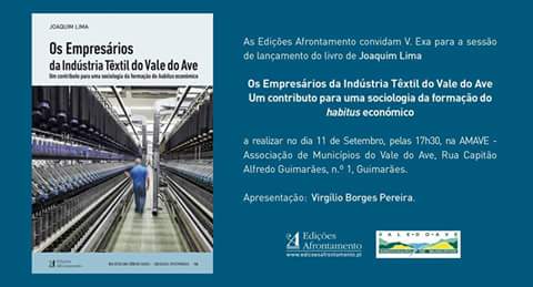 Decorre no próximo dia 11 de setembro, pes 17h30, na sede da AMAVE (Rua Capitão Alfredo Guimarães n.º1; 4800-019 Guimarães) a apresentação do livro “OS EMPRESÁRIOS DA INDÚSTRIA TÊXTIL DO VALE DO AVE” da autoria de Joaquim Lima(licenciado em Filosofia pela Universidade do Porto, Mestre em “Filosofia em Portugal e Cultura Portuguesa” pela Universidade do Minho e Doutor em Sociologia pela Faculdade de Letras da Universidade do Porto).